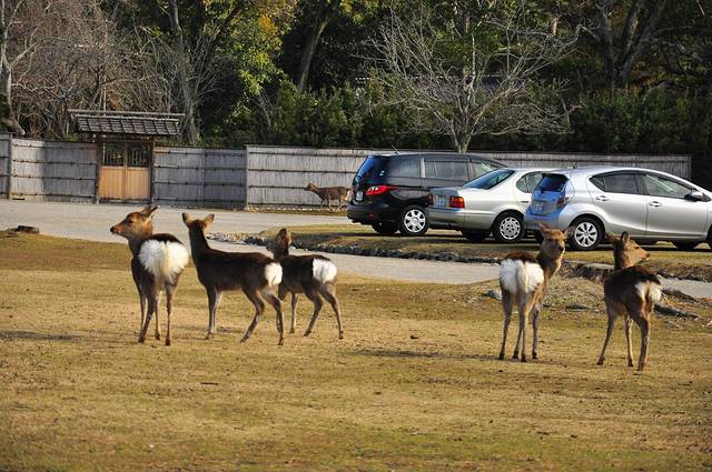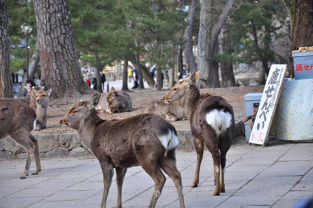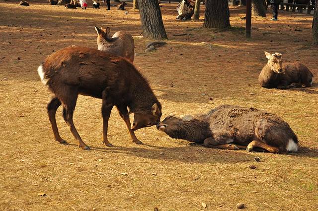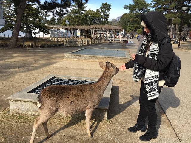 从稻荷到奈良JR,每人670日元。喂小鹿行动开始,买包喂鹿饼干150日元,10片左右吧。喂小鹿专挑漂亮的,聪明的,哈哈,聪明的小鹿会吃完给你“磕头”哦,也就是点头再求吃的,很乖的。也有些坏坏的会一直跟着你,虎视眈眈的,但你会发现你对他摇摇手,他就走了。都是些鹿精啊!