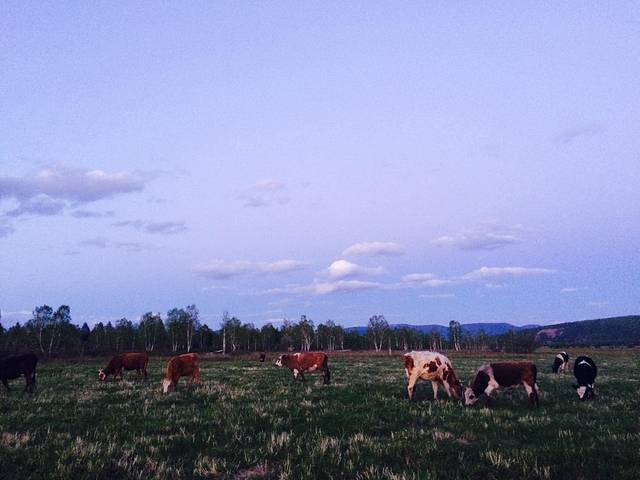 因为不想爬山我就偷摸着一个人趟步回酒店。九点的天空晚霞还没有散去,月亮已经挂上,阿尔山的空气没有南方的湿润,却更加清爽。我一个人晃晃悠悠的往回走,路中央横了一匹大奶牛,我默默的把红棉袄脱下来反着穿,假装很有气势的往前走。