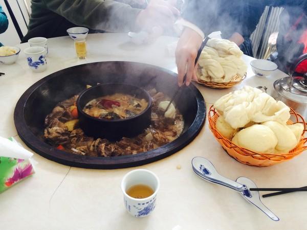 一口大铁锅放在柴火灶上,铁锅中央炖鱼,外面一圈羊排和土豆胡萝卜,再加上一个蒸屉放上馒头和花卷面食。随着锅盖的掀起,我们这群饿狼都拿好筷子,摆好了姿势。