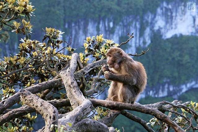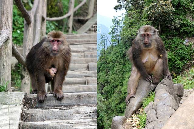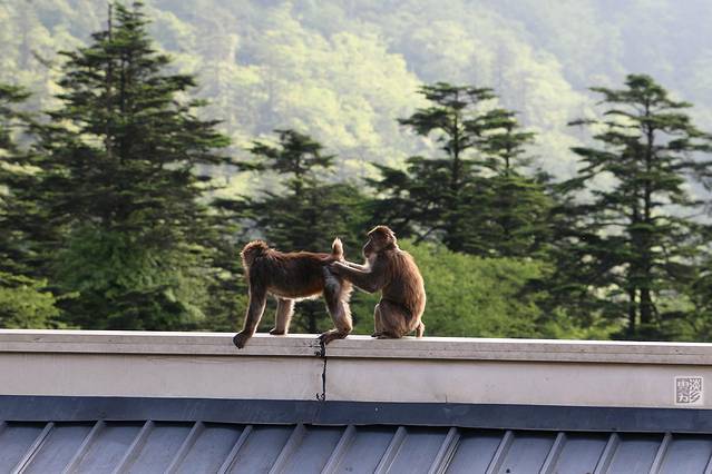 而在从雷洞坪去往接引殿索道站的路上,之前无缘得见的猴群也忽然出现,好惊喜!这里的猴子相对还算挺乖的,除了猴王比较嚣张外,几乎都没怎么骚扰人群。猴群的等级制度好森严呐!出门觅食时都是猴王先吃,接着是带小猴的母猴,然后是其他母猴,最惨的就是剩余公猴了,只能暗挫挫地落在队伍最后面,或者干脆躲在树上,偷偷地拣点残羹冷饭。