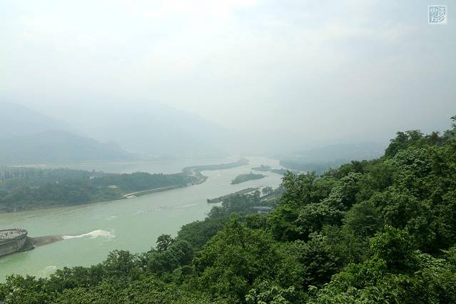 远眺分水鱼嘴,从岷江借走了四成水量(左侧是岷江,右侧是引水渠)