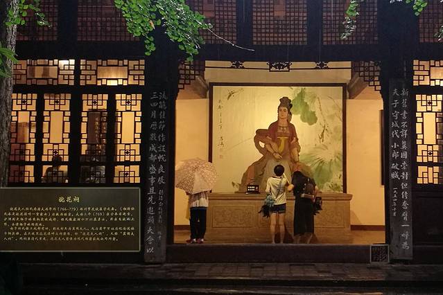 浣花溪边还住过另一位奇女子,浣花夫人(与杜甫不同年代)。她出身贫寒,但美貌聪慧,从小妾被扶为节度使的正室(这在古代是非常罕见的,手续繁杂难度大),战乱年间更散尽家财募集勇士保卫成都,并亲自披挂上阵,可谓一代传奇。