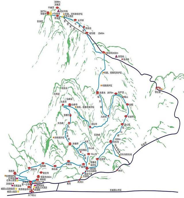 而峨眉的最高峰其实在万佛顶,以前可以乘坐单轨小火车过去,距离大约3公里。但由于火车运行对山顶生态影响较大,已停运多年,万佛顶也不再对普通游客开放。如果有驴友想徒步过去的,可以沿着废弃的铁轨,在铁轨低矮处走铁轨,在铁轨离地面高的时候走以前维修工用的小路。