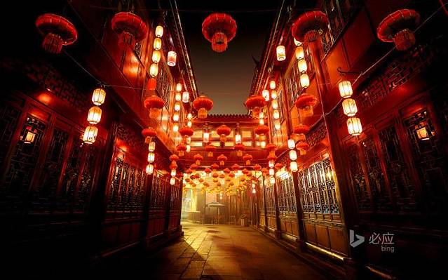 元宵节时曾在网上看到一张非常漂亮的宣传照,如下。阿白说这是在锦里星巴克附近拍的,但也只是为了宣传而已,平时见不到这种没人时还亮满了红灯笼的景象。