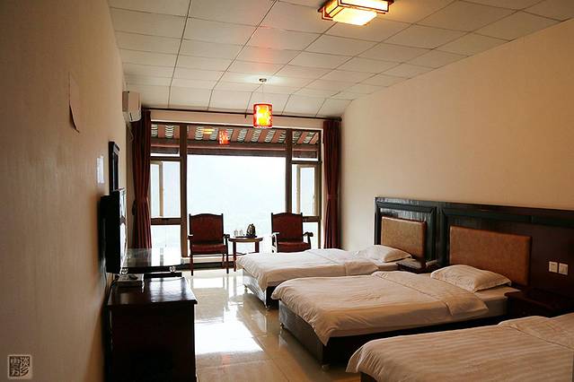 湖边满布着形形色色的农家乐,各种价位都有。我们定的清秀酒家位于左侧山坡最高处,不太好找,但是性价比真没的说,65元的宽敞大房间,无敌观景落地窗。并且离清影阁非常近,拐个弯走2分钟就到。