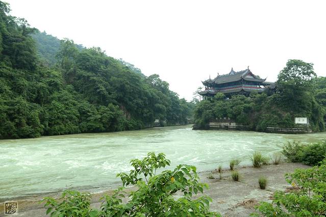 宝瓶口的尺寸计算的恰到好处,水量刚够灌溉成都平原,又不会对岷江下游造成太大的影响。我们来的时候算是雨季,水量充沛,河水有点浑浊,但正好能观看到飞沙堰是如何发挥作用的:它不但是分洪道,还能起沉积泥沙的作用,河水在此转弯减速,泥沙下沉,不会带到狭窄的宝瓶口。而在枯水期,此处水位下降,显露出一片滩涂。