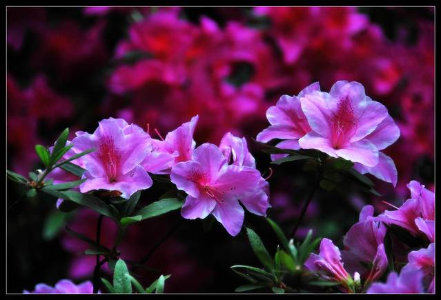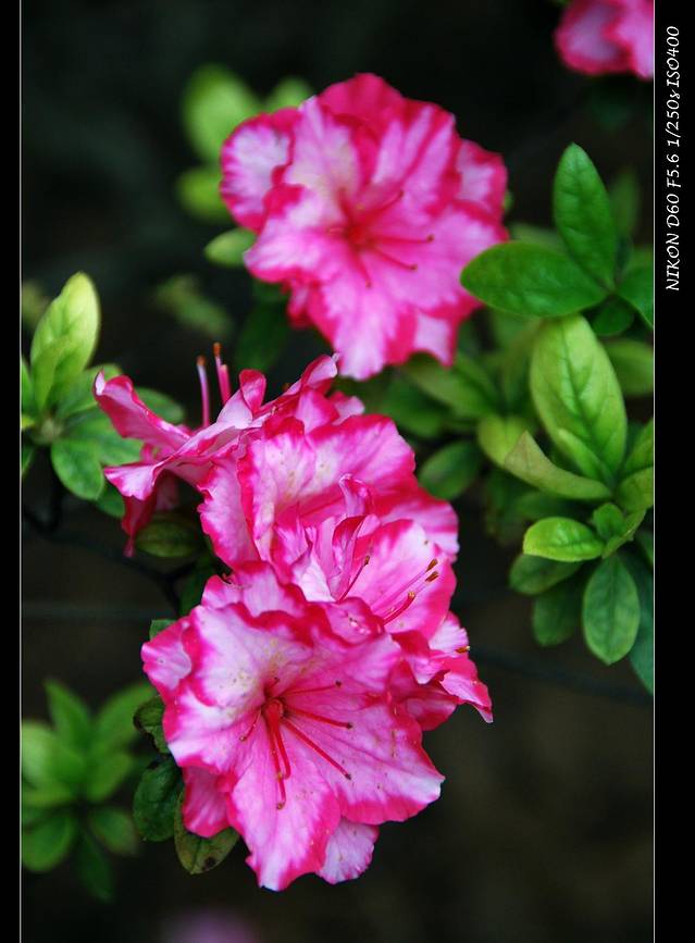 丰丽和凤冠,丰丽的颜色接近玫瑰红,花芯黑色,这品种给人的感觉正如她的名字一样,丰满而又艳丽,堪称杜鹃中的贵妃;而凤冠则不同,花色白里透红,娇艳欲滴,恰如出嫁不久的新妇,已退去少女的娇羞正迎来生命中最美好的年华,于是努力绽放尽情艳丽着,向世人展示着她的无限风情!