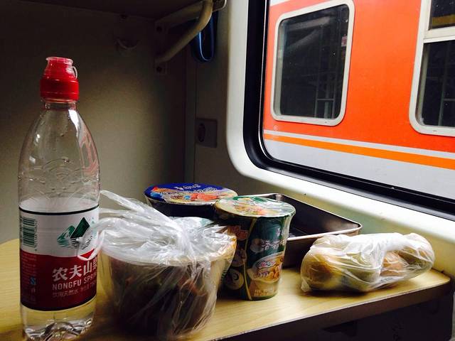 上车啦~中午打包的菜、两桶泡面、几个皇帝柑,我们的晚餐~