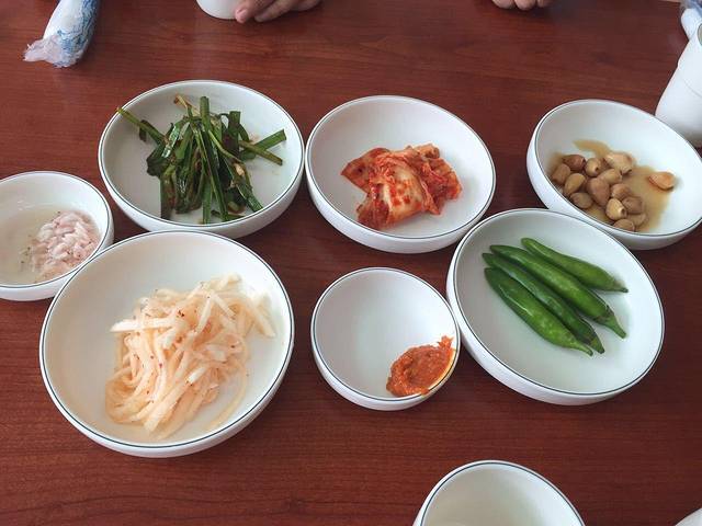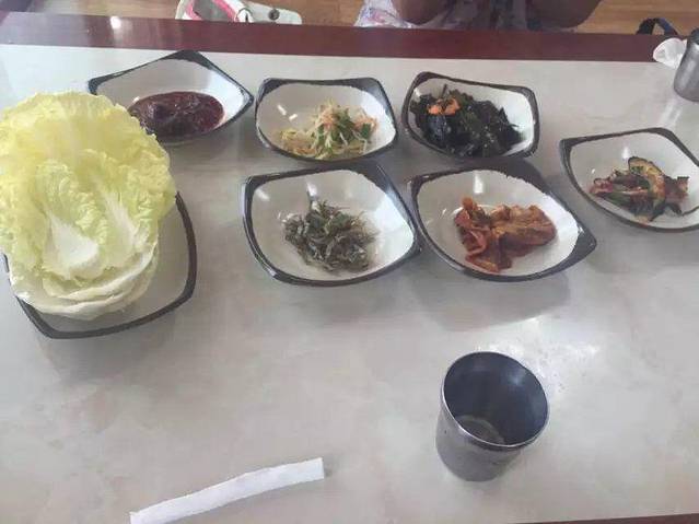 韩国的特色,进店先给你上一桌小菜,有时候人多还会给上2份,吃完都可以再要,但是有些实在是不合我们的胃口,比如上面那个生韭菜,还有那个右下那个辣椒。