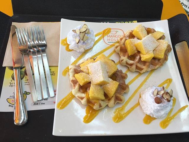 吃的来啦,我推荐这个芒果华夫饼,芒果清香,华夫饼清甜,还有奶油上的坚果也超好吃!