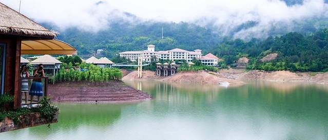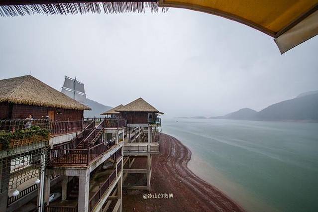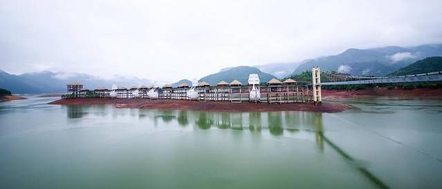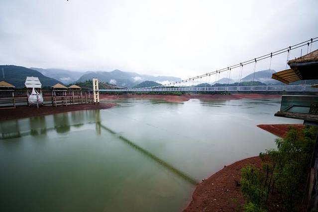 云和湖是浙江的第三大人工湖,在云水间,水中央有17栋独立的小别墅,因为是雨季,云和湖还担任着下游丽水市区的防洪任务,所以水位更低。若蓄满水,房间与碧水仅一窗之隔,想必会有未来水世界的梦幻感。一条横跨湖面的索拉桥就是进出酒店的唯一通道。