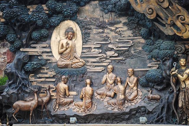 这组石雕上会聚了佛祖、四大菩萨二弟子、五百罗汉等佛教人物。照壁的北面为“唐僧赐禅小灵山图”,这是关于灵山的一段历史典故。