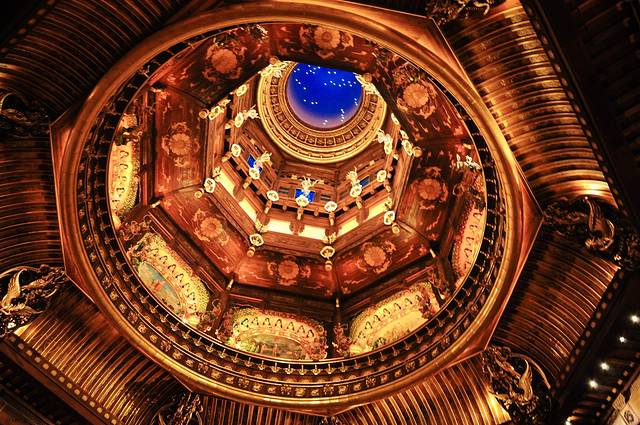 仰天望去,幽蓝色的华塔顶盖繁星闪烁,通透而深邃,仿佛置身一望无垠的蓝色苍穹之下,神秘的苍穹似乎近在咫尺,点点的繁星似乎伸手可及,天人合一间,让人浮想联翩,不觉心生清净安宁之意。
