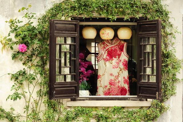 墙角的玫瑰花,盛出的脑袋,仿佛要从窗中走出一位穿着优雅的旗袍女子,丝绸的质地,温婉的韵味,上面有花朵刺绣长及脚踝的旗袍,细腻与雅致的大隐隐于市的情怀。