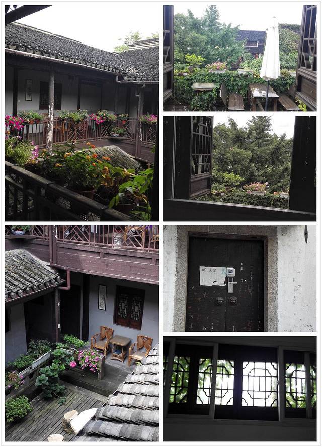 在前台办了入住,100元押金。青旅好像分了三个区,我住的地方是三区,就是大床房和标准间。大门口有门禁,用门卡刷开,这点比较安全。里面是2层楼房,有点古色古香。过道是木制的,院中有各种花草,一楼院中有两张桌子,晚上可以乘乘凉。我在二楼,去的时候阿姨正在打扫卫生,说我这间房是大床房里最大的。空间还算大,没有压抑感。最主要的是几扇玻璃窗,采光不错。里面是现代的这种推拉玻璃窗,外面是仿古的那种窗子,往外开的,窗子上都是那种藤蔓植物。外面是旅舍2楼的咖啡馆,偶尔有人,摆了几张木制桌子,周围也都是花草。下面就是山塘街,站在床上还能看到下面的河。窗外风景不错。