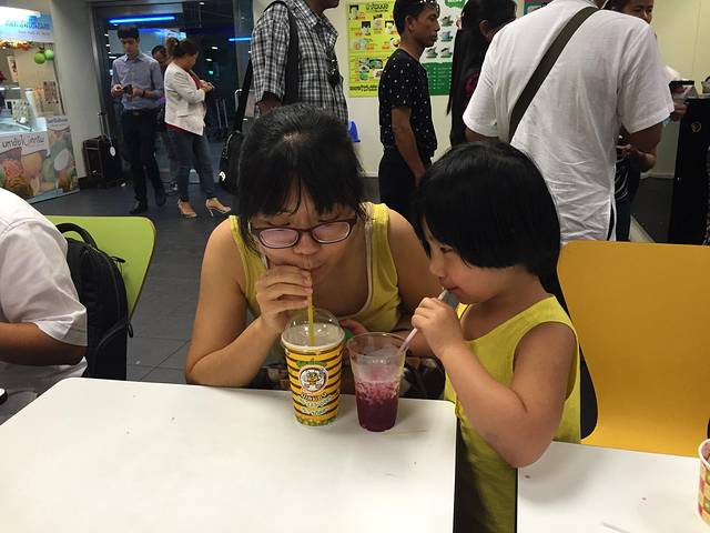 为了换零钱,我们在一层food square吃了点东西,宝就是冰淇淋,我们点了两个饮料,总体感觉甜腻。吃完排队等车,司机说好by meter,可后来送错酒店不说,竟然要了450泰铢,算了,不争了,出来玩就为了开心嘛!