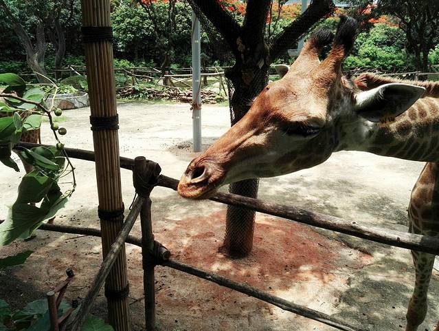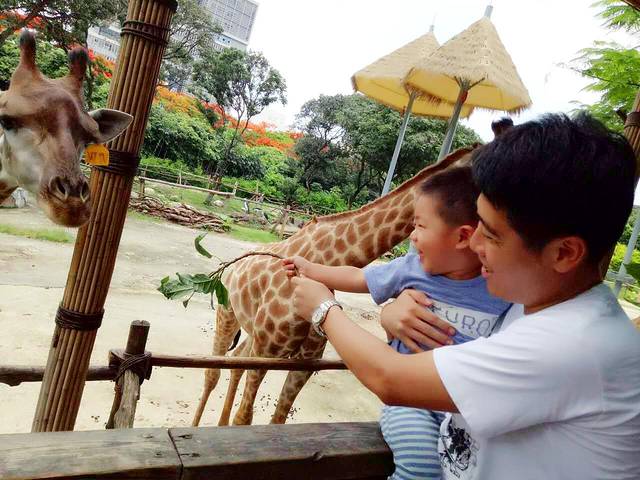 正好是午饭时间,跟长颈鹿互动一下 《笑。儿子学会一句:来来来。