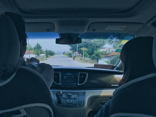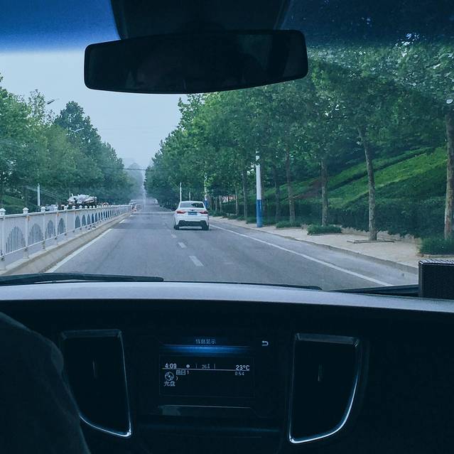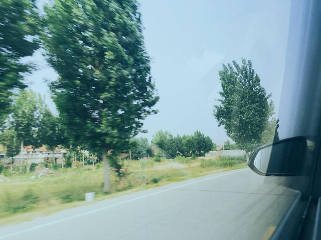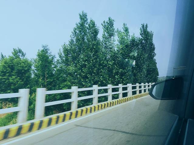透过车窗,你可以看到路边骑着摩托车或者电动车刚刚赶集买菜回来的人,也有乡间地头的拖拉机,上面载着的不是农具和化肥,而是一家人一年的丰收希望。忽地,车走到一段两旁都是苹果树的路。看到那些羞答答的苹果挂在枝头却又躲在纸袋里面只是偶有几个调皮得露头观看。又有,车穿过两座山间的小峡谷。两侧的郁郁葱葱从天上蔓延到地上,又蔓延进我的眼睛里。