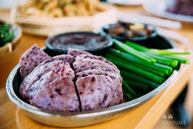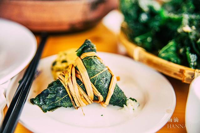 掺杂着桑葚汁和桑葚坐的馒头,真的是一项绝配。不知道是哪个吃货中的大神想到的这种组合。我们一行人都被这几块小馒头征服了。有点桑葚的甜味但是丝毫不腻。再搭配特制的虾酱。真是回味无穷。桑葚叶包的粽子也有独特的味道,当然这个粽子吃的时候不用剥皮。简直是吃货的福音。