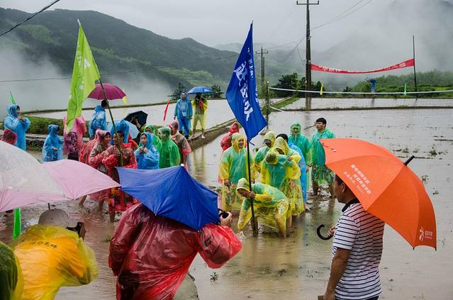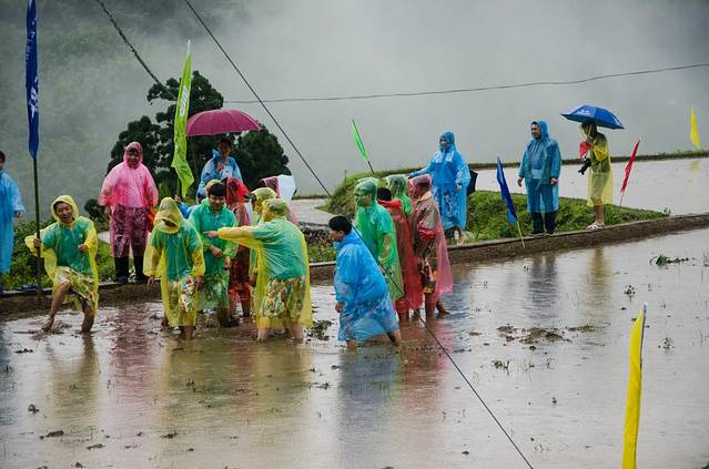 穿着雨水、打着雨伞参加梯田比赛,是不是很傻呢?其实不然,这是对生活困难的挑战与美好生活体验的接受!