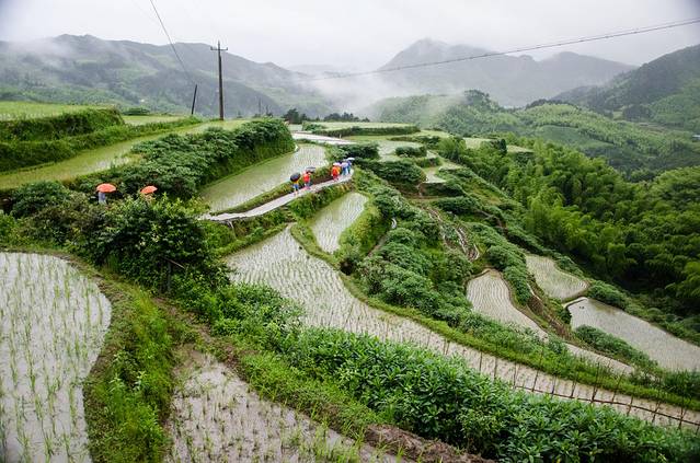 我们小伙伴们被热情感染了,无法自拔。并执着的打着雨伞前往梯田去体验体验了。