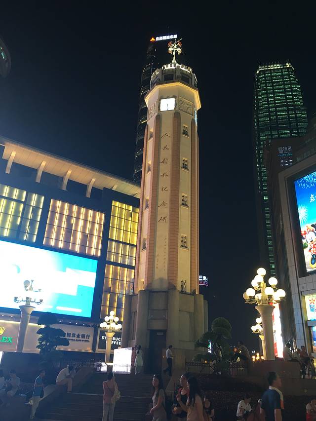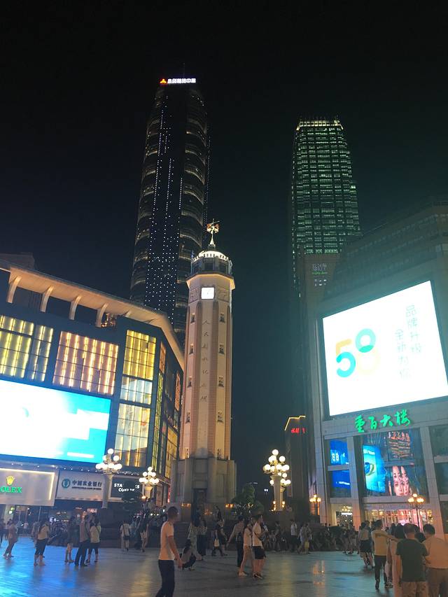 夜晚的解放碑,很多游客驻足。灯火璀璨的街道和商铺让你有种置身在幻境的错觉。