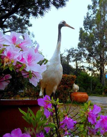 餐厅外散步的鹤。哎哟,这里就拉客啦?!