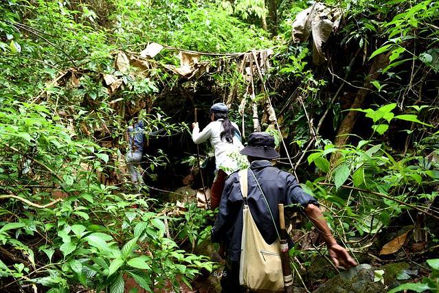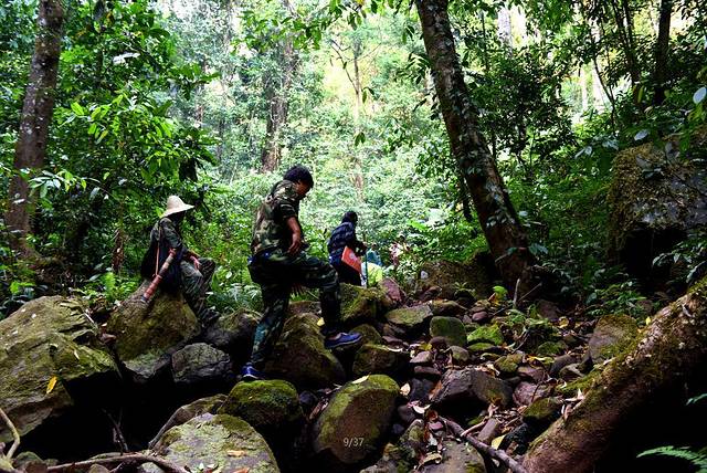 在走过一小段铺满厚厚枯叶的山路后,情况很快发生了变化,在郁郁葱葱的密林中,山林里的路越来越难走,沟河纵横,灌木树丛里根本就没有路,杂草、藤蔓、枯枝、灌木、枝桠布满山间,稍不慎,就会摔个仰八叉,领队用随身携带的大砍刀给每个人都砍了一根结实的“登山棒“,还不停的在前方用砍刀开路。我们艰难的行走着,探究着这片森林的深邃,一边要小心脚下的石头和腐朽的木头,同时还在东张西望,希望能遇见长臂猿和别的生灵。突然,一只飞出一人高的草丛里的野鸡进入了我们的视线,都惊呼起来。这些惊叫明显的吓到了它,飞快地消失在丛林里。