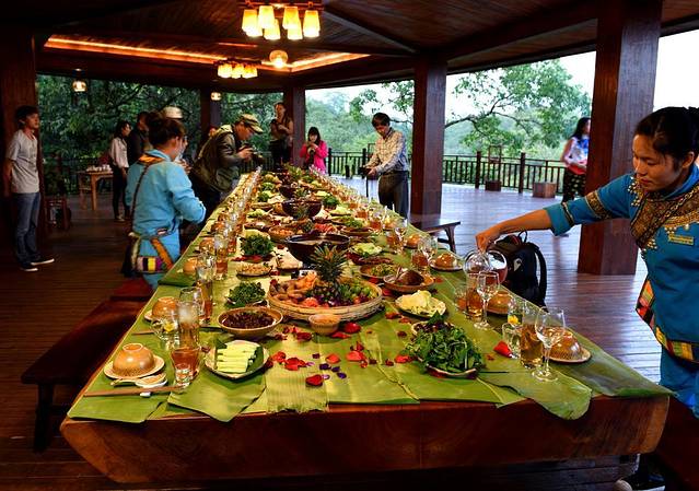 在原始森林穿越回来后,我们在普洱太阳河国家公园的小熊猫庄园内品味了让人垂涎欲滴的哈尼族长桌宴和充满激情的歌舞表演,哈尼族长桌宴也称之为”资乌都”就是依照传统仪式,每年农历十月,长桌宴在哈尼族的新年期间举办三天,整个寨子分三拨轮番做东——每家精心准备一桌酒菜,连桌椅一起抬出到街心,摆出百米多长的街心盛宴,接着全寨公推出一位德高望重的老人主持祭龙仪式,因此这长桌宴也可叫“祭龙比菜”。随着时代的发展,哈尼族的长桌宴渐渐走出深山,让更多人了解这个少数民族的特殊文化。