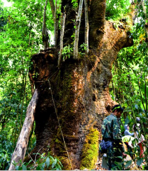 在艰难的行走中,领队用不标准的普通话告诉我们前方有一棵千年树王,所有人都好奇的想一睹为快,被队友连拉带拽爬上湿滑的陡坡时,眼前又是一片幽暗的树林,当领队指着一根粗得像是一堵墙的树的时候,我们惊呆了,几千年的树王,静默的生长在这片原始的热带雨林里,十几个人围成圈都将它抱不过来,在它几千年的光阴中,目睹了这原始森林里的万物更替,似乎在它那苍劲的躯干中隐藏着整座森林里生灵的密码。