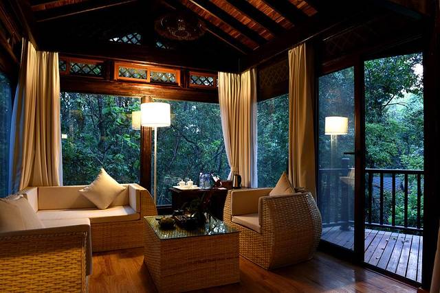 在太阳河国家公园的小熊猫庄园,坐落在在郁郁葱葱的森林中,古木峥嵘,苍藤密布,鸟叫蝉鸣,猿啼阵阵,是一个让灵魂私奔的绝佳去处。所有的精致的木屋别墅都错落有致的依地势而建,浑然天成,在这里,可以让阳光轻抚还在睡梦中你,在散发着植物花草香气的小径上散步,在小熊猫、马鹿和森林呵护中沐浴,也可以沏一杯普洱茶,在露台上静静的发呆。
