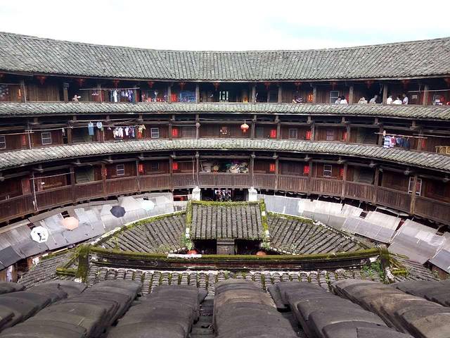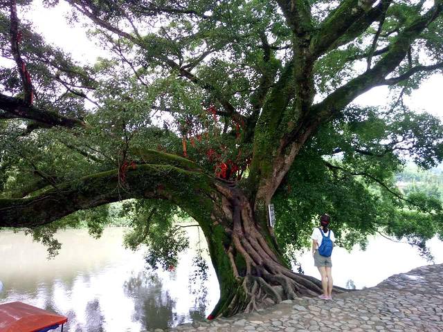 早上9:19我们坐上了厦门北开往南靖站的动车,全程半小时,出了南靖火车站,我们很幸运,门口一拐弯儿处正好有个长途大巴到云水谣,我们兴高采烈的坐上了大巴。动车站都是在郊区的,沿途路边很多农作物,仔细一看,是大片的香蕉树。这是在我们北方看不到的。大概中午11点多点,我们就到了传说中的云水谣和土楼。坐门口的小巴进入景区(一共三个景点),它会把你直接带到最里边的一个景点-怀远楼。它是个圆形的土楼,里边居住着32户人家。每间屋子都不大,一户挨着一户。白天土楼里大多是老人和妇女。我和同学都觉得,是我们这些游客打扰了他们的正常生活。因为在没有变成景点之前,每家是不需要上锁头的。土楼一共四层,黄土砌成,窗户很小。很快就逛完了。沿着村里的小路,可以到达下一个景点-云水谣大水车。其实我倒是觉得村子里边的古榕树是最值得驻足的。有些榕树的树龄已有600多年,可以追溯到明朝。沿路继续前行,来到第三个景点,是个方形的土楼-称为和贵楼。也是四层,这里的人家稍微多了一些。这里的仙草蜜很清凉解暑,小菠萝也很甜。