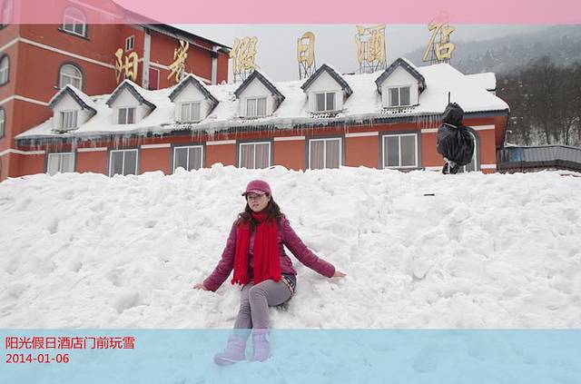 这张照片里包含了三个酒店都在靠山边滴位置上,最远处是阳光假日酒店,中间是斯堪的纳度假酒店,最近画面这个是映雪酒店,与它们隔了一条马路滴是枫叶酒店和雪花酒店