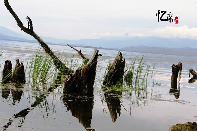 好喜欢这种景,水里枯树夹杂着水草倒映在平静的水面上。