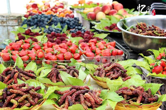 各种新鲜水果,10元一篮子,价格还挺便宜的,像草莓,桑葚这些水果,在杭州老贵了。看着都很有食欲吧,好想都抱回家。