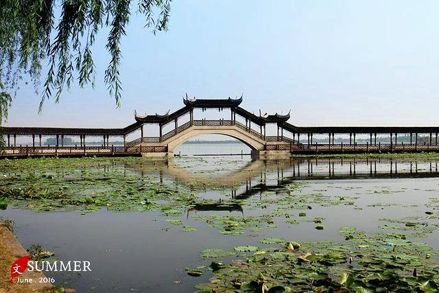 当你走近古镇,一眼望见这美丽独特的廊桥与这一湖郁郁葱葱的莲叶如此融洽地结合在一起,你就一切全明白了。