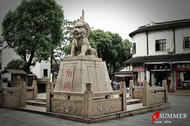 甪直镇入口广场,据说这个甪端是保佑居民的。左手边的路口凭票入内,右手边的大路随意进出。哈哈!
