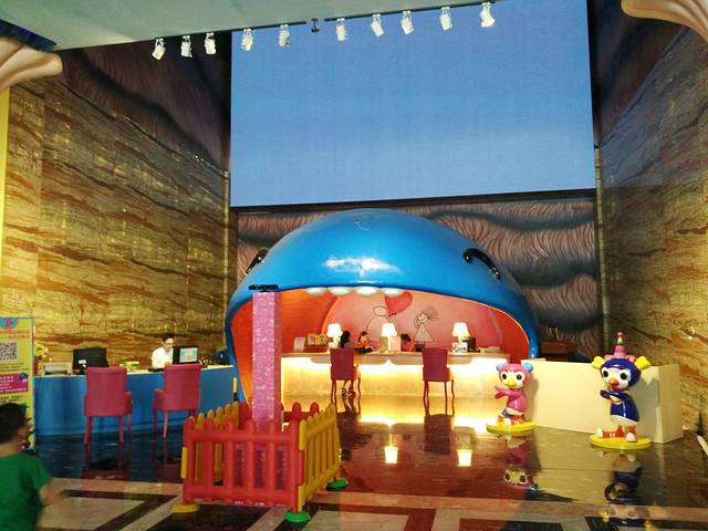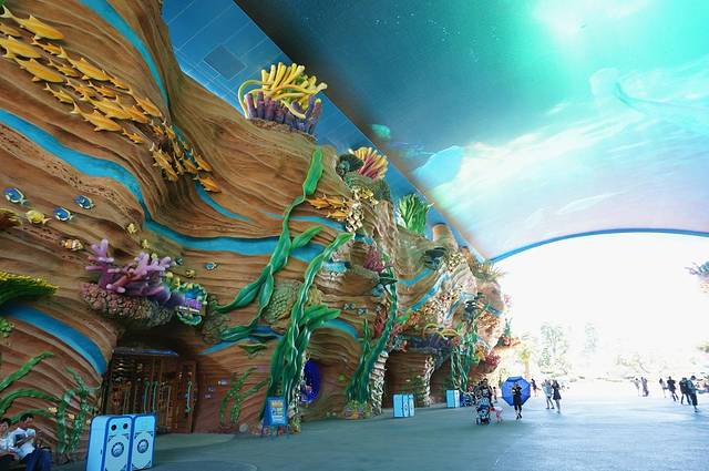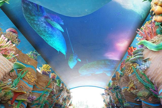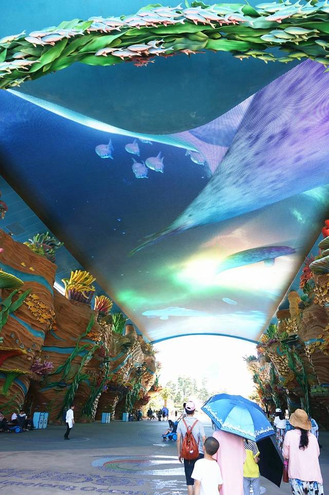大门口有一块巨大的天幕,不时滚动着各种各样的海底美景,很是吸睛。