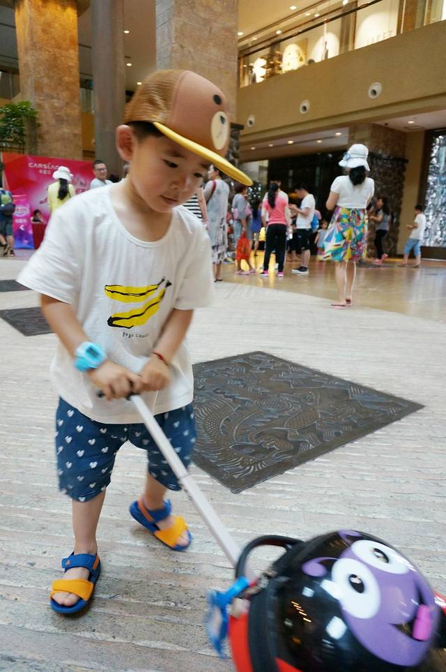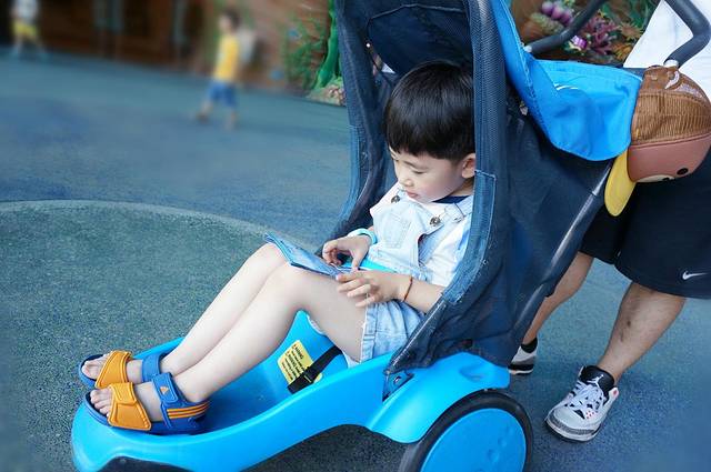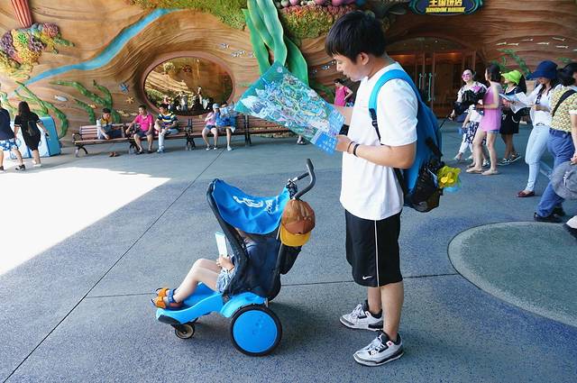在园区门口也有童车租赁,押金300元,租金60元,限30斤以下孩子乘坐。海洋王国的童车质量好于广州长隆,比较新方便推,同样配一把锁。