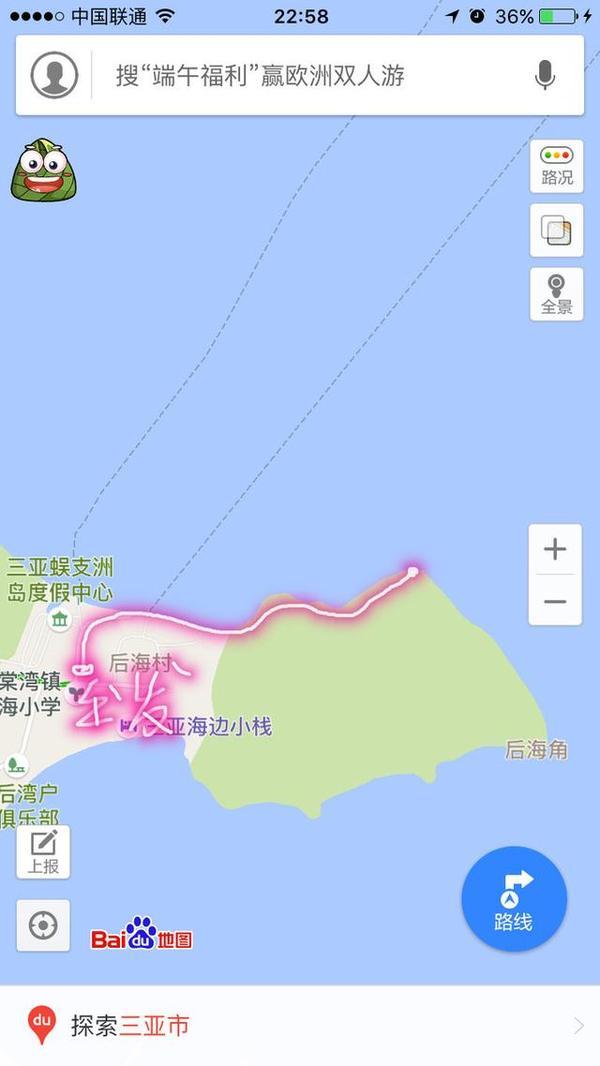 这里看日出是以外 本来是安排第一天 不过去不成 只好临时做攻略 看到说蜈支洲岛看日出是最好的 但是没钱在上面住一晚上 所以想后海村应该也能看到的 问了店家他说冬天的话在皇后湾看是最好的 现在夏天了要在后海山看 吃完了饭就想去探探路 可是没有路灯 觉得危险就回去了 再问一下店家 他直接开地图给我看 指了一个地图上都没有显示路的地方 说是有一条小路的 走到小路的尽头就可以看到的 尽头有石头拦着不会让你过去的 我半信半疑的相信着店家 第二天4点30分起床出发tip:那里好多蚊子,一定要长裤长袖衣服出去啊,不然被咬很惨