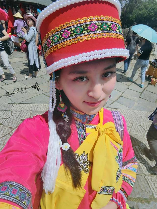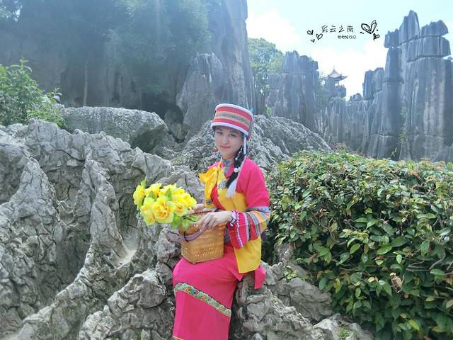 许多游客也纷纷换上了民族服装,打扮成阿诗玛的样子,在石林前留影。