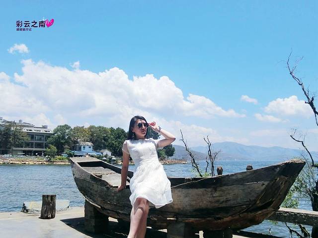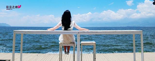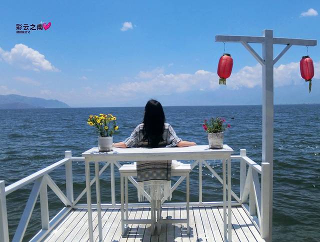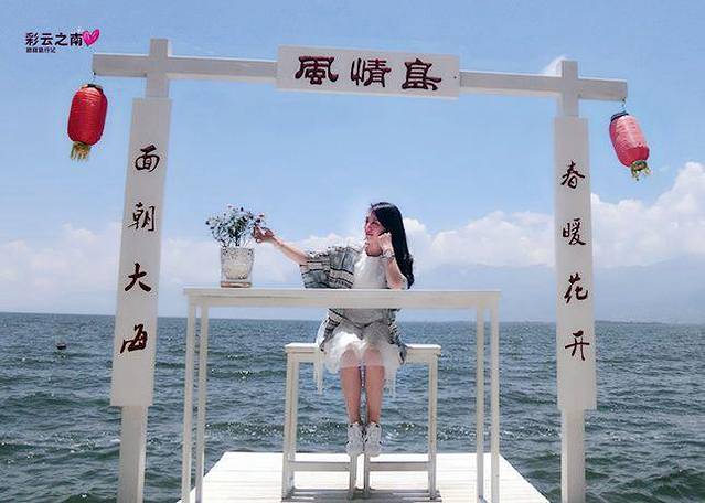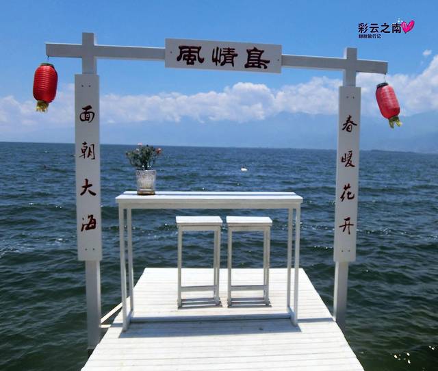 双廊的白桌子到处都是,在南诏风情岛上就有好几处,摆在这里让游客拍照的这里比海地客栈的白桌子更加靠近洱海。