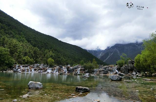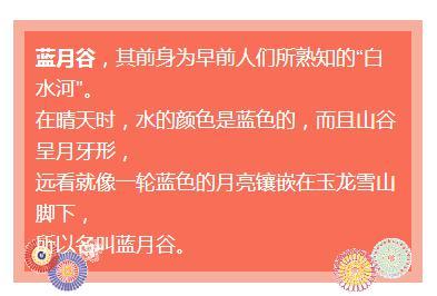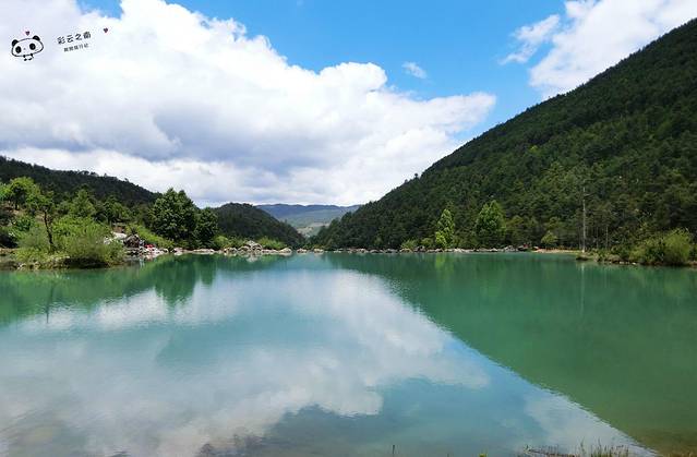 蓝月谷在晴天时,水的颜色是蓝色的,因为玉龙雪山山体中含有硫酸铜而起的化学作用。