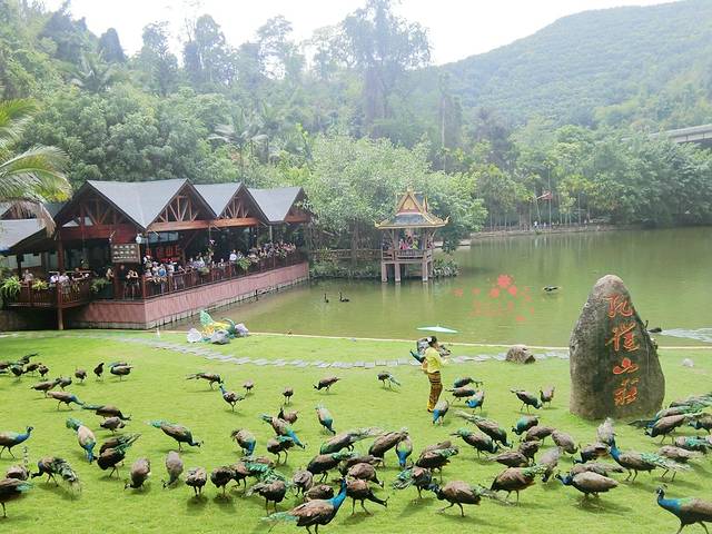 孔雀山庄还是值得一看的,表演很养眼,竹筏先期出场,缓缓的从远处走来一位傣族少女,随着口哨声,大批的孔雀从天而降,好壮观的场面,漂亮极了。