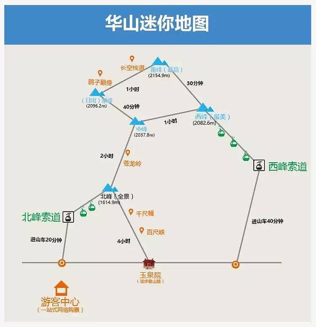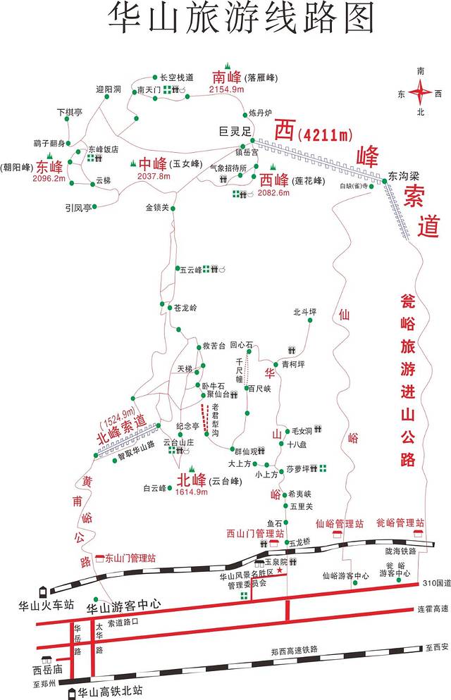 华山是五个峰,东南西北中,从地图可以明显看出来,北峰最低,离其他几个峰都比较远,东南西中4峰离得比较近。