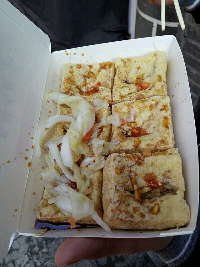 炸臭豆腐,咸菜就是辣白菜,蒜味的,味道很好