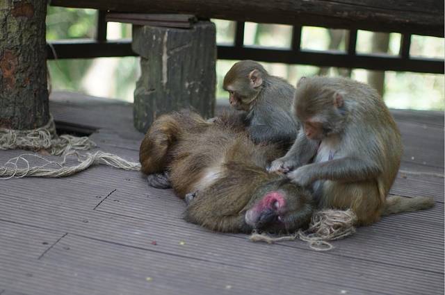 这里有不少猴子,它们久了同人相处,不在忌讳什么,有吃有喝都养胖了,大模大样躺在躺在那里。