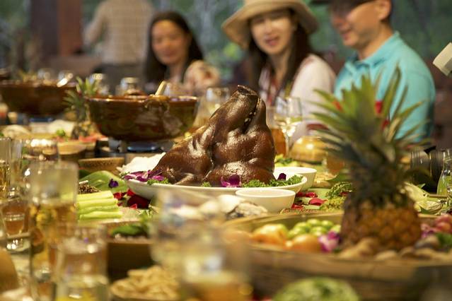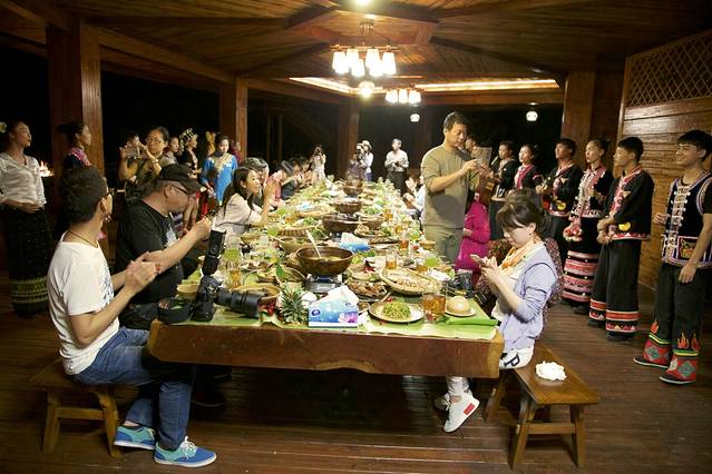 为了让所有人能够明白长桌宴的来源和文化,哈尼族的姑娘们和小伙子一边弹琴唱歌,一边喝酒吃肉,以唯美动听的歌声来诉说哈尼族的古老文明。只是随着日渐发展,为了让人们更能之间感受到哈尼族的文化和热情,小熊猫庄园的长桌宴已经过改良,没有繁琐的仪式和庄重的氛围,但热情和闹腾依旧没变。由于长桌宴在哈尼族每年只有一次,因此为了表达他们的热情,哈尼族会在庄园里以长桌宴的方式来接待每一个来到这里的人,因为长桌宴是哈尼族接待客人的最高仪式。所有很多时候不必要说太多热情的话,当一排长长的像长龙一样的长桌宴席摆在面前的时候,你就能感受到你在哈尼人心目中有多高的地位了。