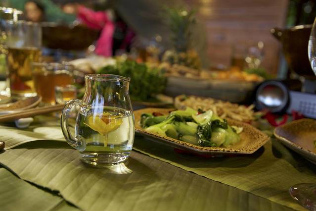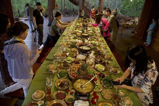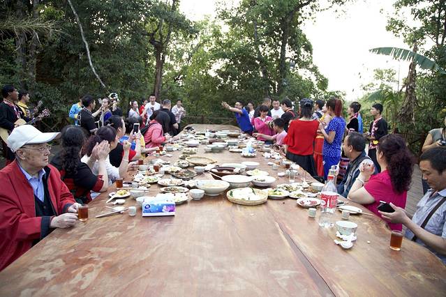 直到来到普洱太阳河国家公园的小熊猫庄园,我才真正接触到这个神秘的”资乌都”。原来哈尼族的“资乌都”用今天的话说就是长桌宴,依照传统仪式则长桌宴在哈尼族的每年农历十月的新年期间举办三天,整个寨子分三拨轮番做东——每家精心准备一桌酒菜,连桌椅一起抬出到街心,摆出百米多长的街心盛宴,接着全寨公推出一位德高望重的老人主持祭龙仪式,因此这长桌宴也可叫“祭龙比菜”。