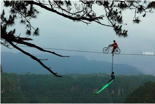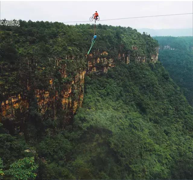 在谷口广场迎面的大峡谷上空,一条钢索连接峡谷两端,年轻的演员正在骑着单车摩托车横跨,看他们矫健的身姿,再看看几百米的深渊,不禁捏把汗。